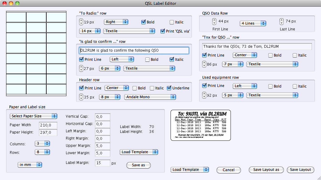 A major update is the QSL label printing. Now you can print on any paper size on any label format and you can create your own design. I have included 2 examples how it works. 2 QSO lines on a Avery 5460 sheet (US-Letter) and 4 QSO lines on a Avery 3475 (DIN A4)