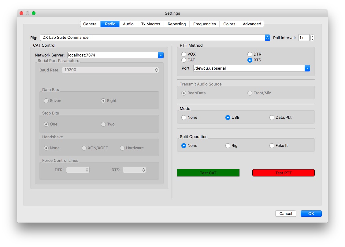 Hope these are the images you wanted to see. The image from WSJT-X shows TEST PTT as red becasue as I took the screenshot, WSJT-X was transmitting on FT8 :D