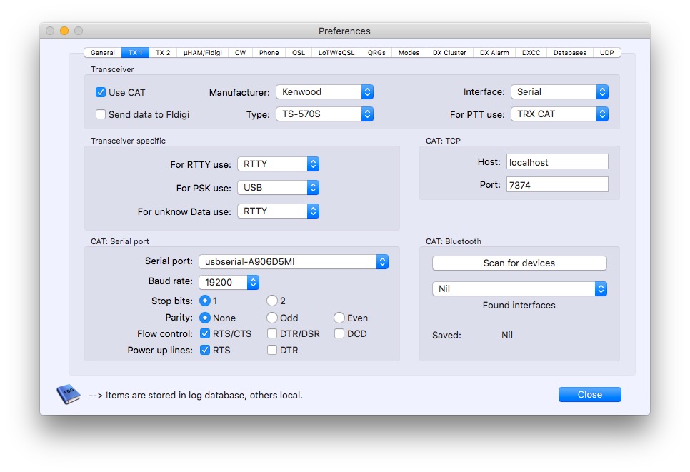 I use a serial device connected to the RS232 port on the Kenwood for CAT control from the rig to Mac, and that uses CAT to control the PTT. WSJT-X uses a separate cable (from a different port) specifically for the Kenwood 570D, which takes the audio and mic from the Kenwood out to two 3.5mm connectors, and also uses a USB device to control PTT - hence CAT for PTT in RUMlogNG and RTS for PTT in WSJTX.