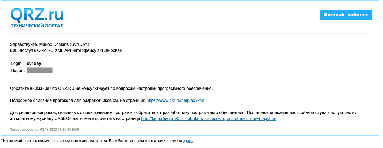 At qrz.ru there are two sets of userid/password. The first set is a pair of your email address and a password and it is used for access to the web site. The second one though is another pair of userid (most probably your callsign) and another password, which is used for API access, that is calls to the database of orz.ru, originated by an application like RUMlog. One has to follow a registration procedure to API/XML service first, and then one acquires the second pair of userid/password. In my case, I had to post a message to the support team, because there was an error during the registration process. The support team replied me by an email to try again the registration process, so this is what I did. After the registration was completed, I received an automated email, as below, with my new pair of userid and password. Since then it works flawlessly!