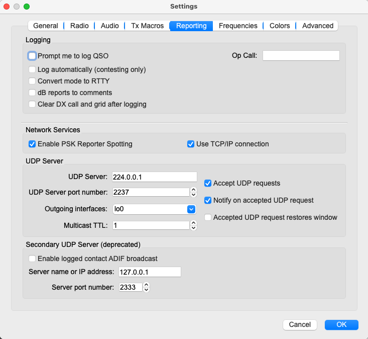 1. In WSJT-X on the "Reporting" tab changed UDP server to localhost
