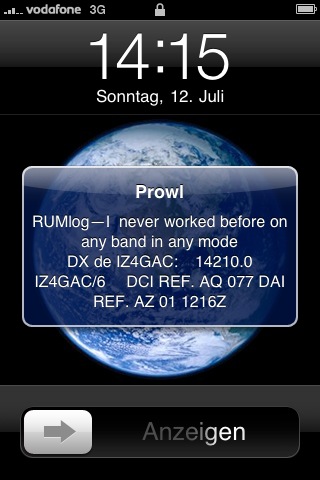 Prowl is a Growl client for the iPhone. Using Prowl, you get pushed DX Alerts from RUMlog within seconds direct to the iPhone. This service is free, only for the app you have to pay few bugs. No changes are required in RUMlog.