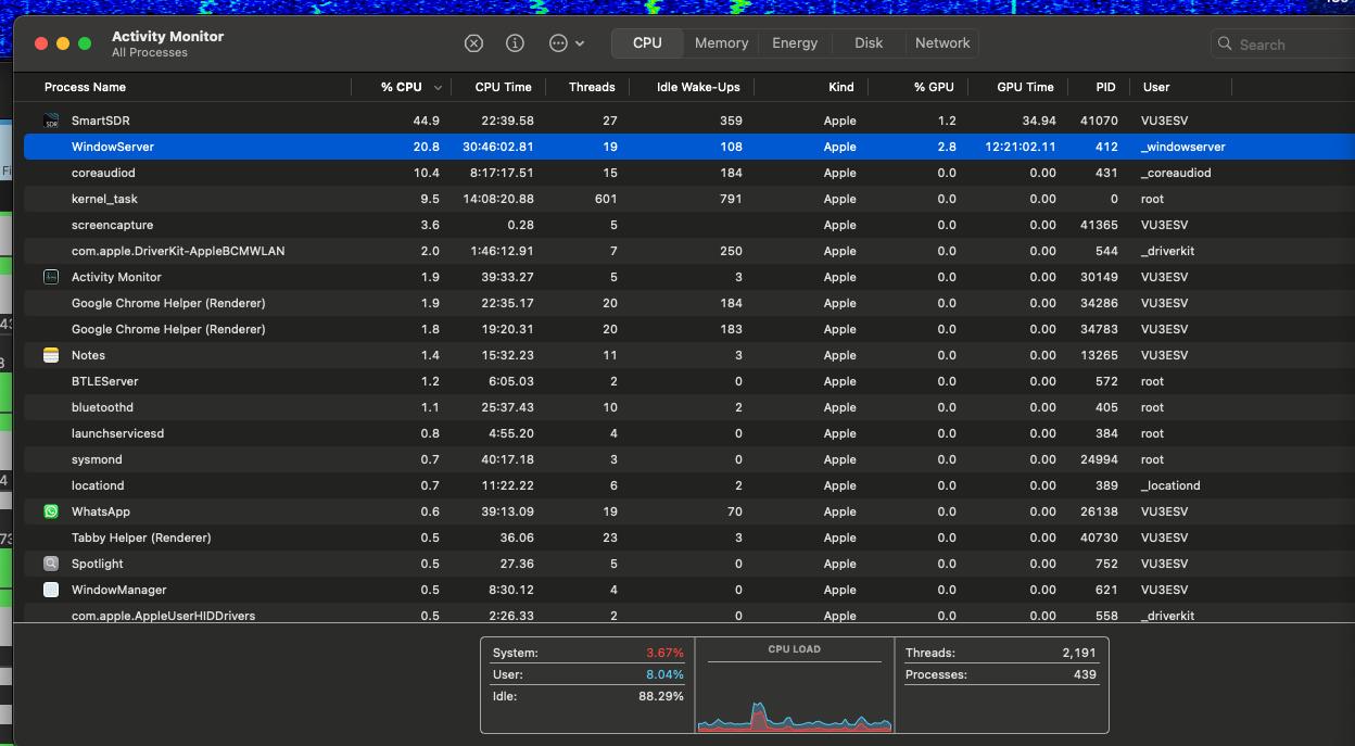 Activity Monitor from the M1ac is attached here, this screen shot is taken when the RumlogNG starts hanging. It appears the resource consumption at the time of application hang is at normal levels.