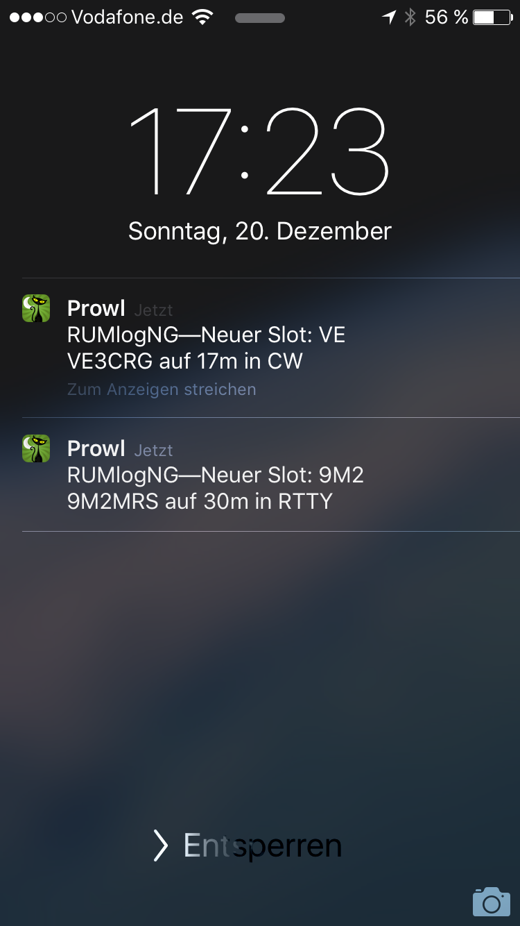 I thought of the same, but haven't been able to find any software that does this. I do use Prowl for other apps, but that would require additional integration within RumlogNG. .