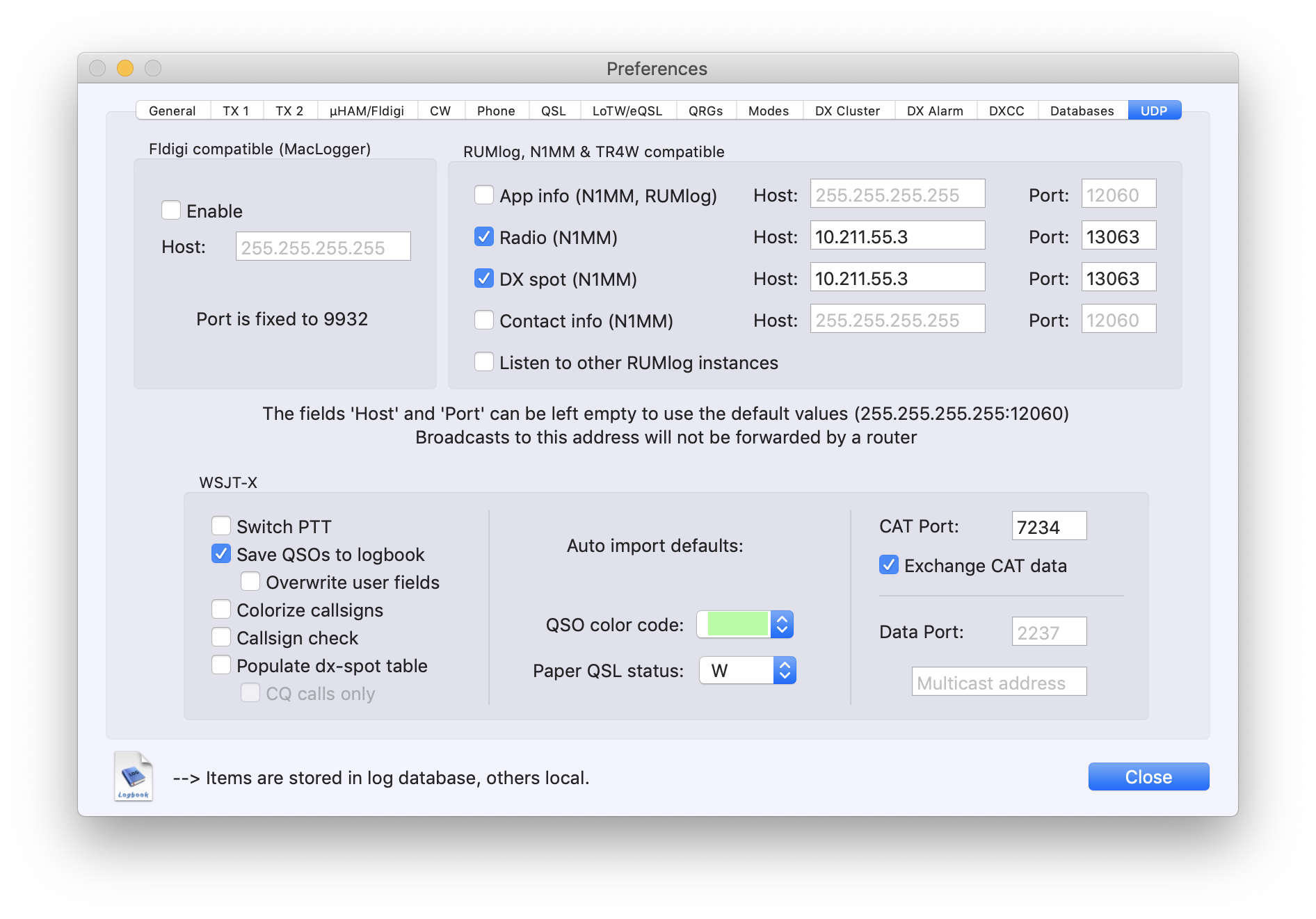 The bandmap needs N1MM or RumlogNG in my case to send spots information as well as radio information to port 13063. My Parallels Desktop VM runs on internal IP 10.211.55.3. You can see how I set it in RumLogNG to make it work with Waterfall Bandmap. If you can make RumLogNG send radio info every 100Hz, that probably will be good enough! Another thing is, the spots N1MM sent out have different colors, to differentiate between country/band etc. If RumLogNG can do similar thing, that would be even better!