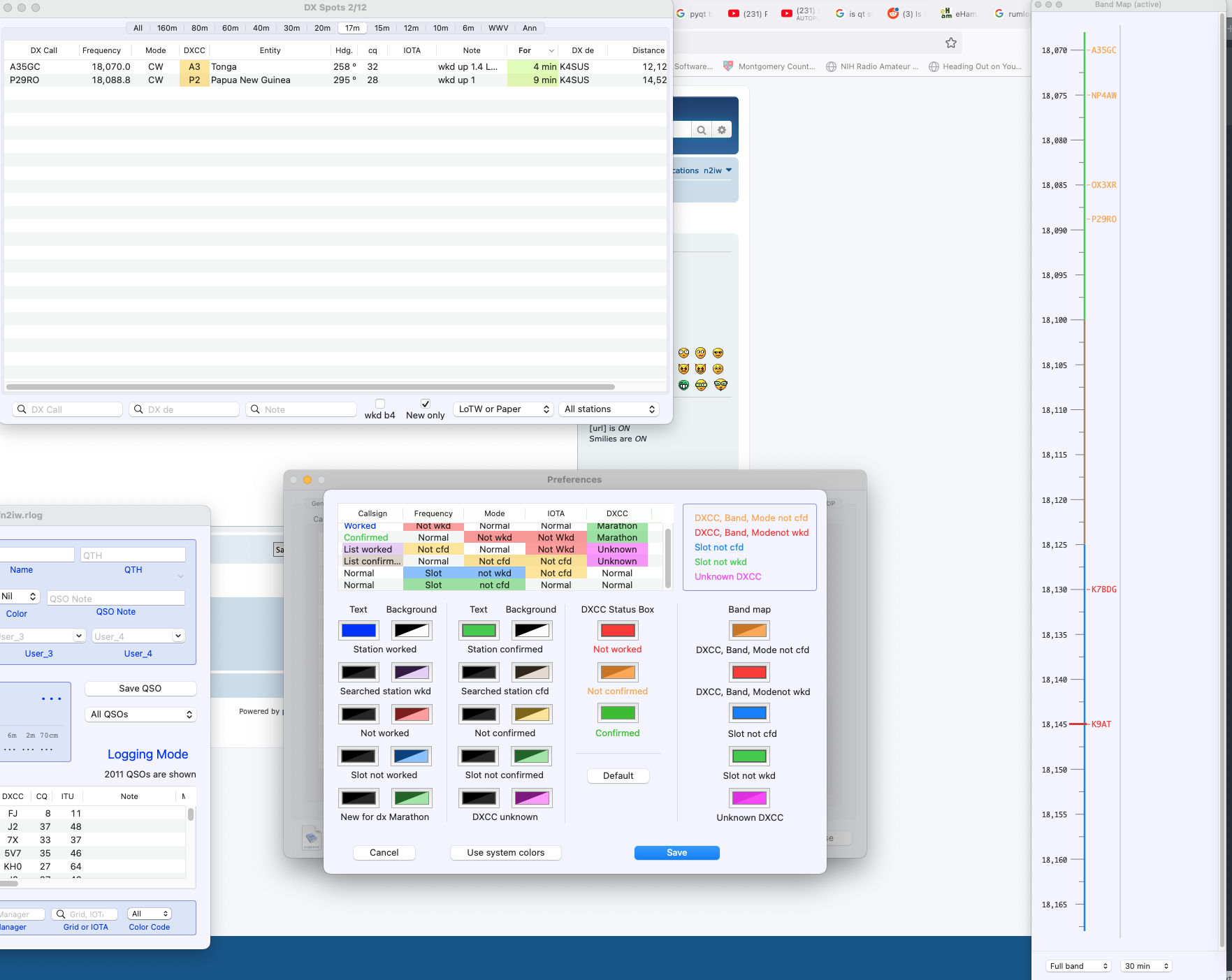In my settings, I set "band mode not cfd" to yellow and "band mode not wkd" to red. However, I see the opposite in the band map. In the attachment you can see A35GC(band not worked for me) shows yellow and K7BDG (band not confirmed) red. You can see my settings in the attachment also. Same thing with "slot wrkd" vs "slot cfd". BTW. colors in the spot window are correct.