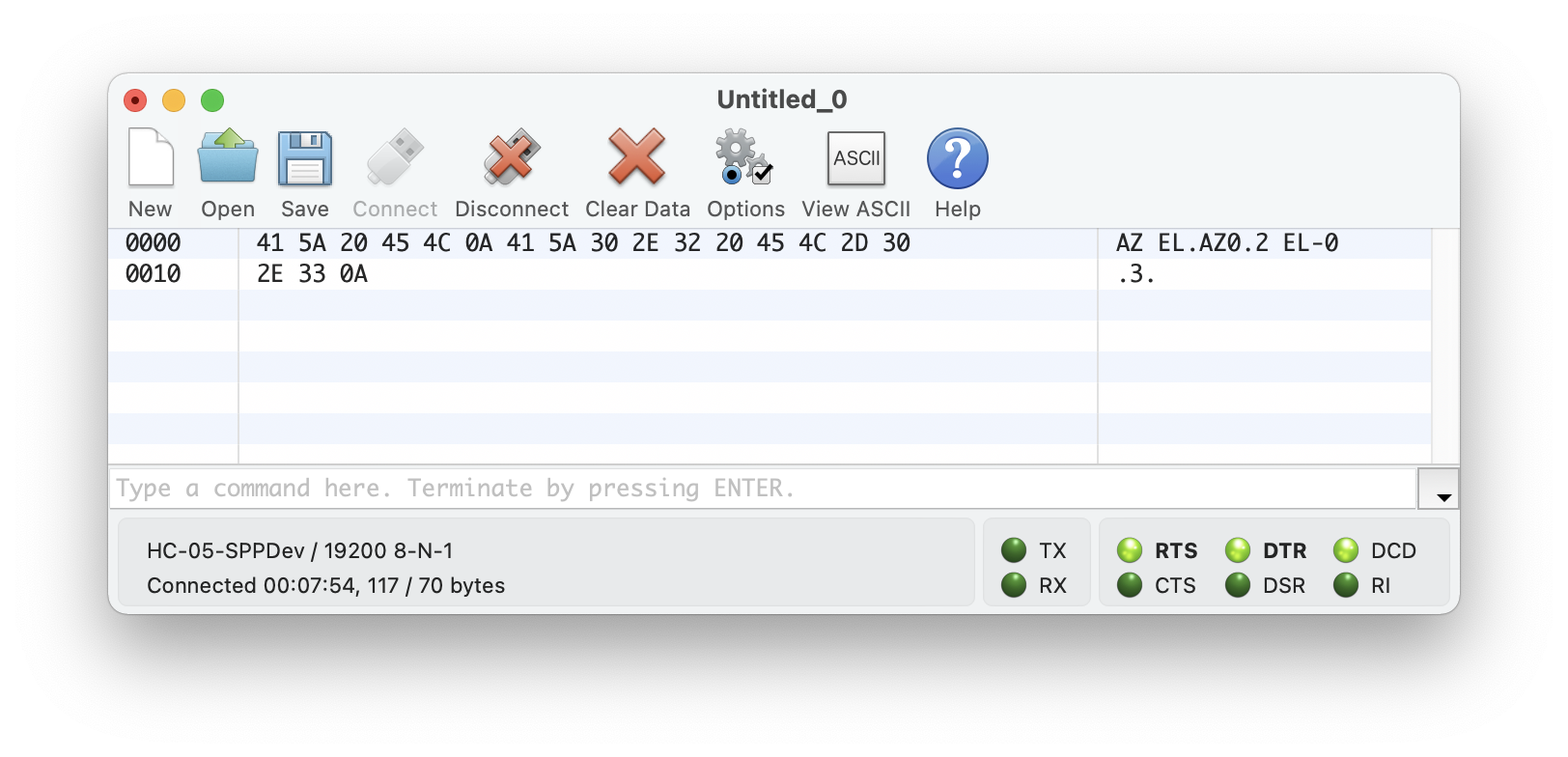 Can you provide similar screen shots? I've just sent AZ EL 0x0A The return was AZ0.2 EL-0.3 and AZ48.2 EL27.3 The answer must be terminated by a 0x0A