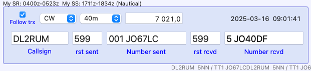 Here, after entering the callsign, the locator is automatically retrieved from previous QSOs. When I press Enter (using ESM), the cursor moves directly to the single remaining input field, allowing me to quickly enter the counterpart’s sent sequence number.